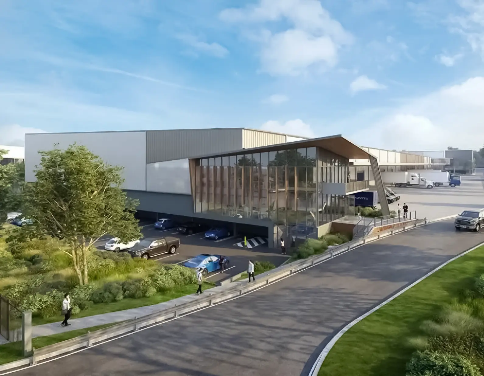 Dexus Granville is a purpose-built distribution centre with an expansive 16,400 sqm distribution centre with a 2,000 sqm two-storey office, it boasts separate heavy vehicle and passenger vehicle entry points, ensuring optimal logistics flow while streamlining operations. The office space is strategically situated at the front of Road, providing maximum street exposure. The striking tapered form of the building is highlighted with an impressive two-storey glass façade complements a large, timber textured cladding awning portal. Further enhancing the building’s design, small vertical portal structures punctuate the rear entry of the office, leading directly to the recreation area. SPA SCOPE: Modelling and documentation in BIM from design development stage to construction documentation.